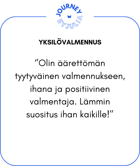 Valmentajana haluan olla matkassasi mukana, tehden siitä mahdollisimman mukavan ja mutkattoman. Tarjoan sinulle avaimet pysyvään muutokseen ja työkalut tasapainoisen arjen rakentamiseen.